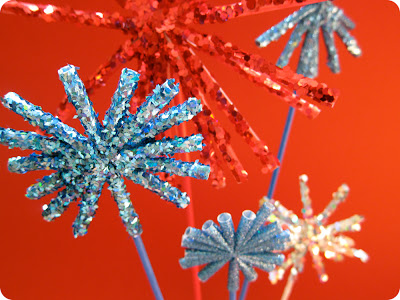 To make it, gather 8-12 straws together, tie tightly in the center with a piece of waxed twine and bend to fray the straws out into a circular star form. Paint the straws with white glue and sprinkle on different glitters. I used this fabulous Martha Stewart Crafts holographic glitter that comes in the shapes of stars, hexagons and diamonds. The variety of chunky glitter flakes makes the fireworks more dynamic than just glittering them all with your standard fine glitter. Make 5 or 6 fireworks and display on skewers in a vessel filled with colored sand, or even silver dragees.