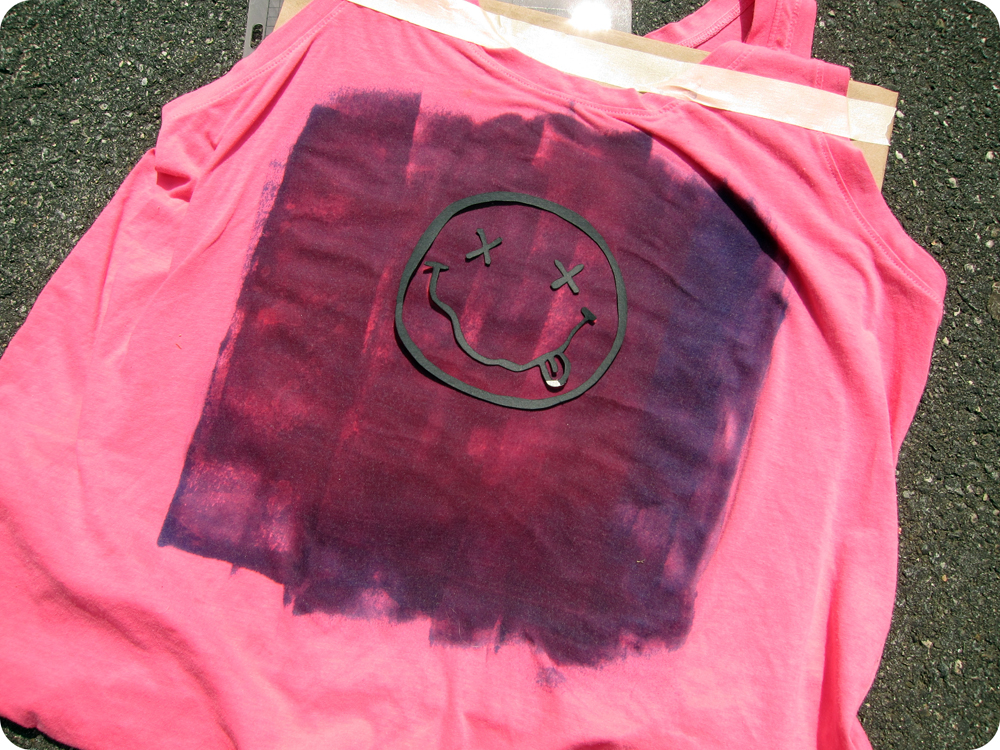 I pulled out Inkodye and printed out the Nirvana smiley face. Inkodye is a light sense dye that's definitely a lot more fun (and experimental) than just straight up RIT dyeing. Because Inkodye can be used with a "resist", we thought it could be an interesting way to create a one-off band shirt... fast.