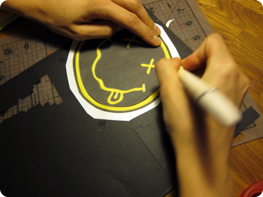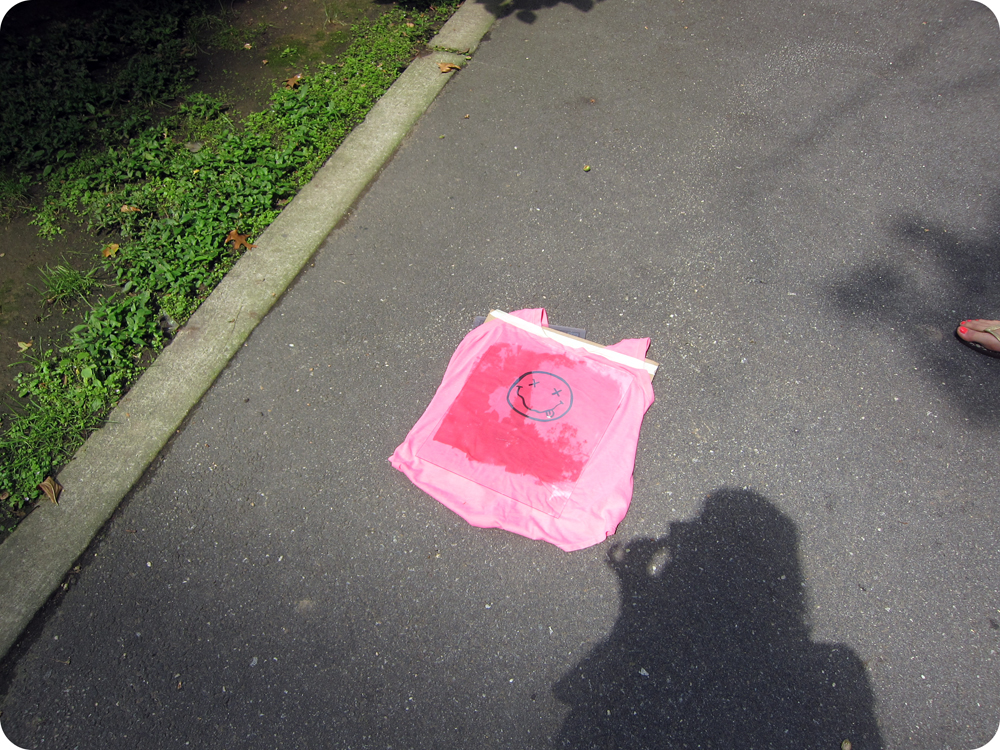 I taped the Nirvana face to a piece of black card stock and cut it out with a craft knife. After placing a board in the inside of the shirt and taping it in place, I rolled the inkodye on the shirt with a foam roller, not being too concerned with it being perfect—like I said, we were doing this fast.