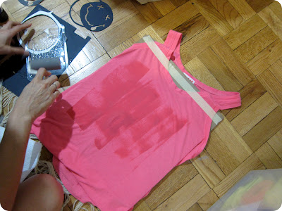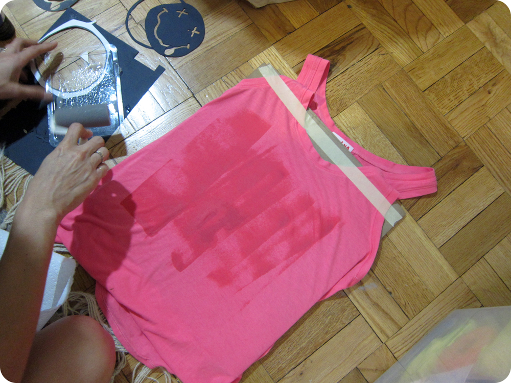 Once a thin layer of the dye was applied in a square on the front of the tee, I placed the cut-out face over it.